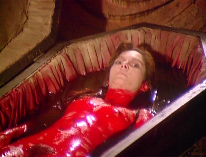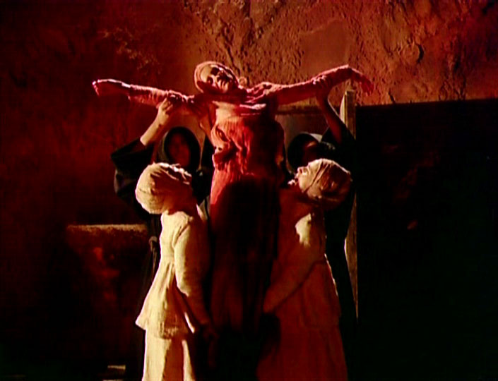 Lo mejor de "Alucarda", además del título reversible, es el impacto audiovisual que poseen muchas de sus imágenes. Decorados y vestuario comparten una misma inspiración alucinada: las monjas van cubiertas de la cabeza a los pies con vendajes y gasas blancos, manchados de sangre a la altura de la entrepierna, y la iglesia donde transcurre gran parte de la acción está atiborrada de Cristos, exvotos y velas. Los desnudos de las jóvenes protagonistas son igual de retorcidos: Tina Romero curva su cuerpo hacia atrás como una auténtica poseída, y Susana Kamini, en la escena más perturbadora de la historia del cine anormal, surge de un ataud lleno de sangre profiriendo alaridos de ultratumba. Erotismo o histeria: esa es la cuestión.